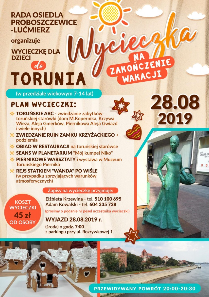 Rada Osiedla Proboszczewice-Lućmierz serdecznie zaprasza dzieci w wieku 7-14 lat na wycieczkę do Torunia na "Zakończenie wakacji".
