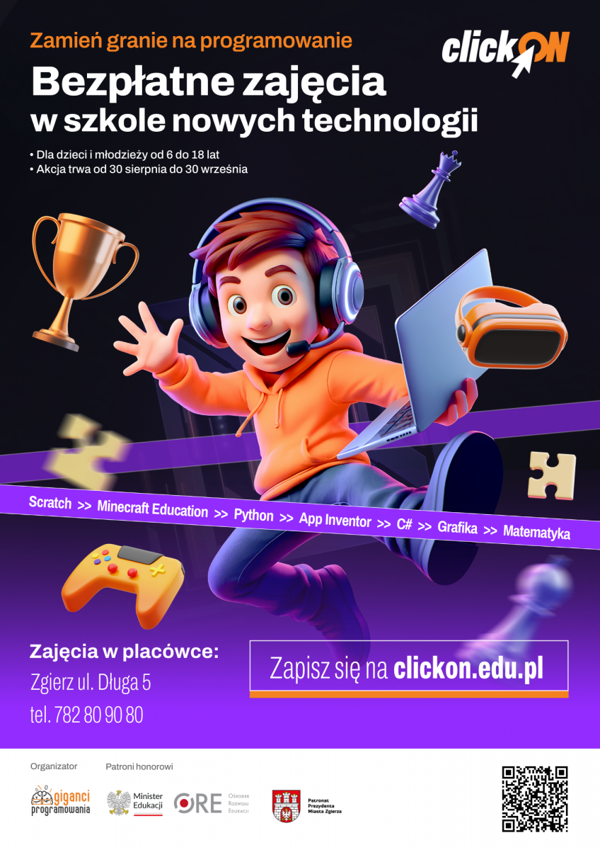 ZAPISY WYSTARTOWAŁY! Zapraszamy dzieci i młodzież w wieku od 7 do 18 lat do udziału w wydarzeniu clickON "Zamień granie na programowanie", czyli bezpłatnych zajęciach z programowania i nowych technologii. Spotkania stacjonarne odbędą się w Zgierzu przy ul. Długiej 5 w terminach: 30 sierpnia, 6 września, 13–14 września, 20-21 września 2025 roku)
