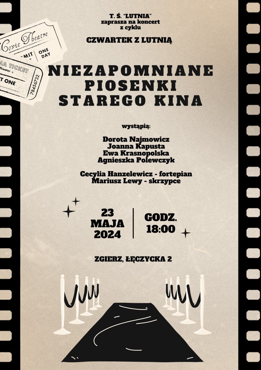 T. Ś. "Lutnia" zaprasza na koncert z cyklu "Czwartek z Lutnią" pt. "Niezapomniane piosenki Starego Kina" (Facebook wydarzenia)