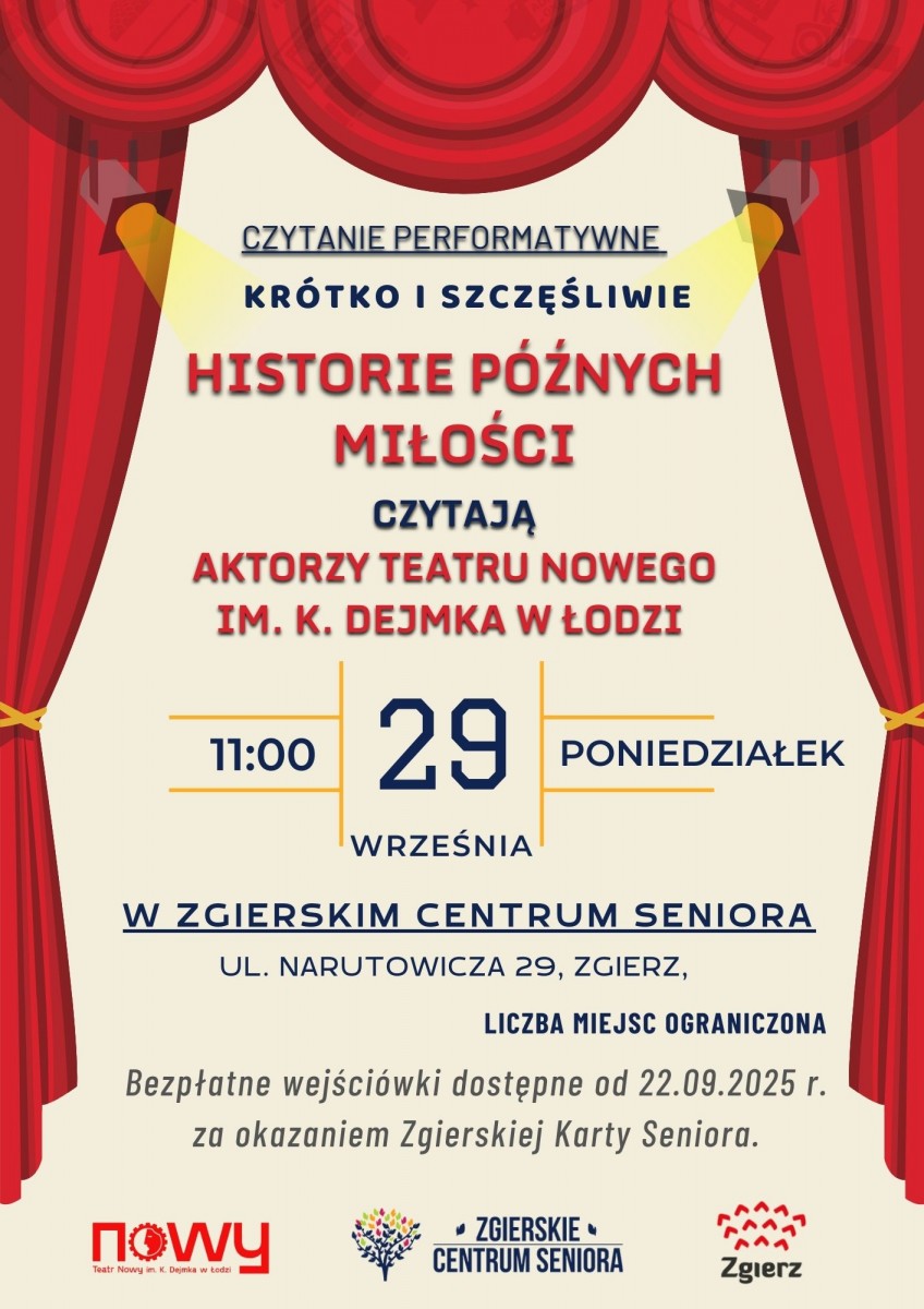 Bezpłatne wejściówki dostępne za okazaniem Zgierskiej Karty Seniora od 22 września w Zgierskim Centrum Seniora (ul. Narutowicza 29)