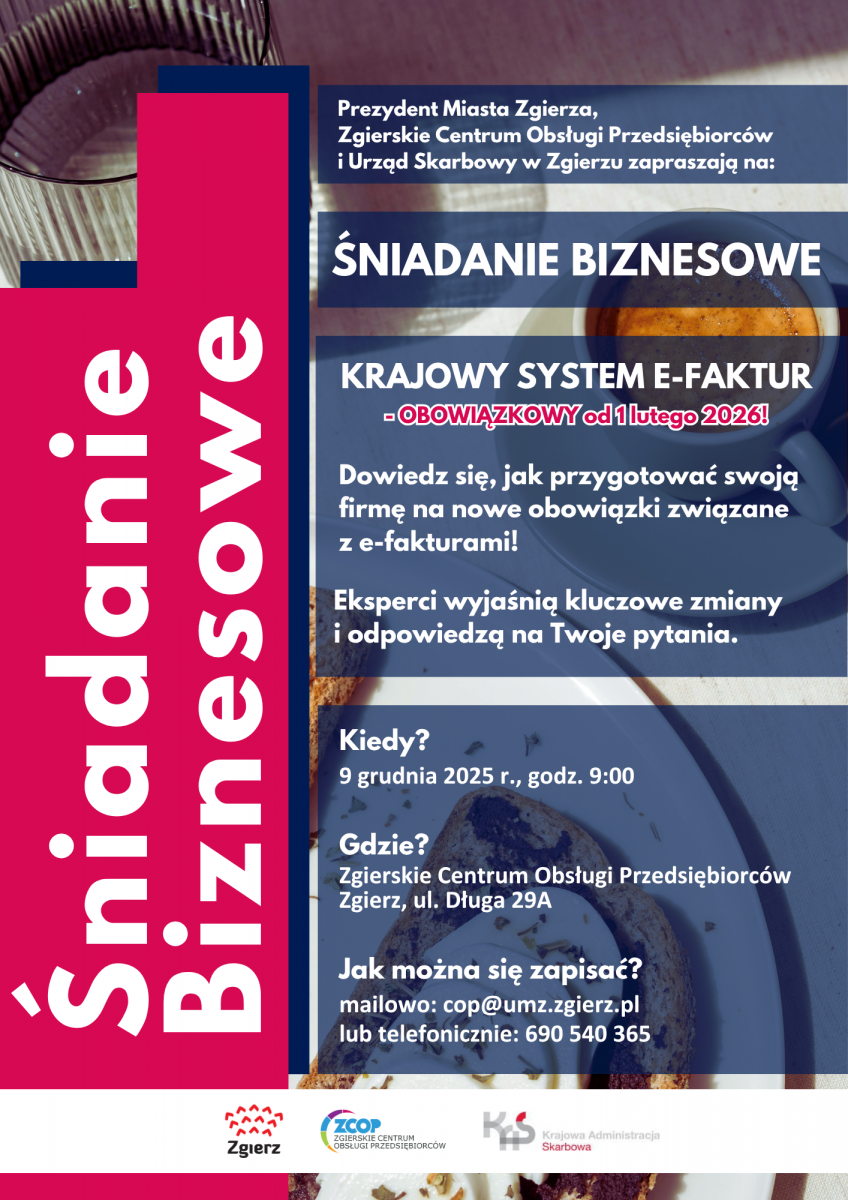 Serdecznie zapraszamy na kolejne Śniadanie Biznesowe, poświęcone tematowi Krajowego Systemu e-Faktur (KSeF).