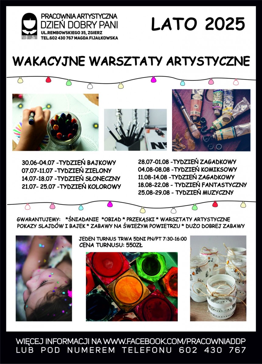plakat z ofertą wakacyjnąPRACOWNIA ARTYSTYCZNA DZIEŃ DOBRY PANI - ul. ks. Sz. Rembowskiego 35 (tel. 602 430 767) - Facebook pracowni