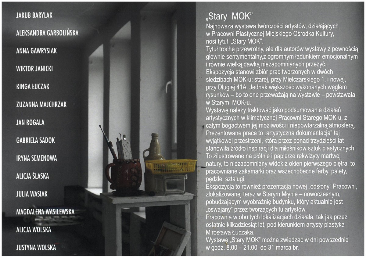 Najnowsza wystawa twórczości artystów działających w pracowni plastycznej Miejskiego Ośrodka Kultury pn. "Stary MOK" ma tytuł nieco przewrotny, ale dla jej autorów z pewnością sentymentalny, z dużym ładunkiem emocjonalnym i dużą dawką niezapomnianych przeżyć. Ekspozycja stanowi zbiór prac tworzonych w dwóch siedzibach MOK - przy ul. Mielczarskiego 1 oraz w Starym Młynie, na Długiej 41A. Na wystawie przeważają rysunku węglem, które powstawały głównie w dawnej siedzibie placówki.