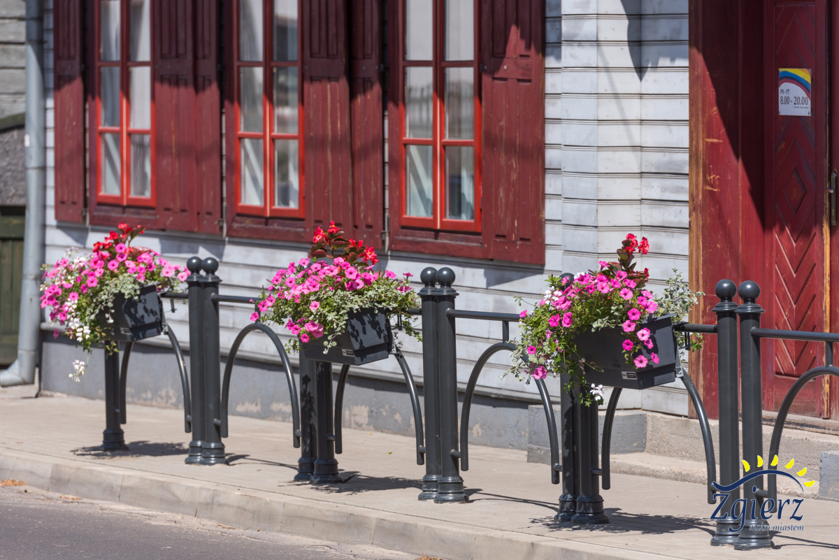 Ozdobne barierki ze skrzynkami kwitnących kwiatów