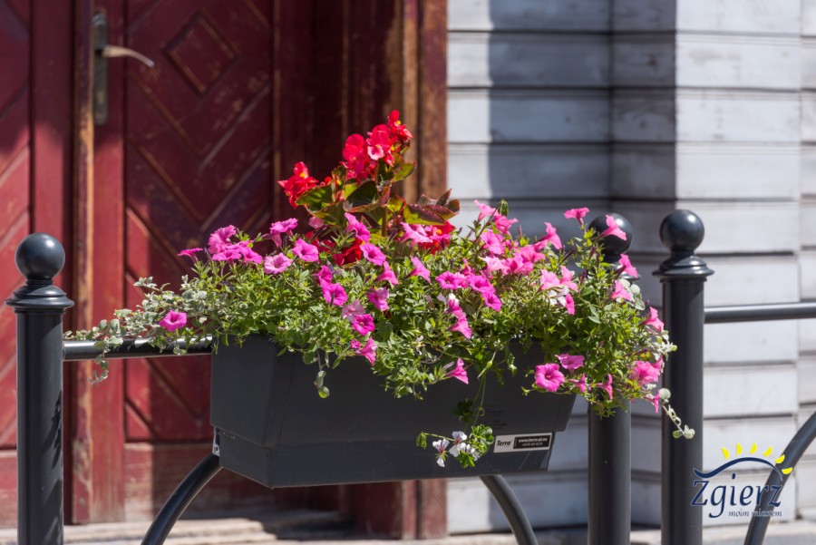 Ozdobne barierki ze skrzynkami kwitnących kwiatów