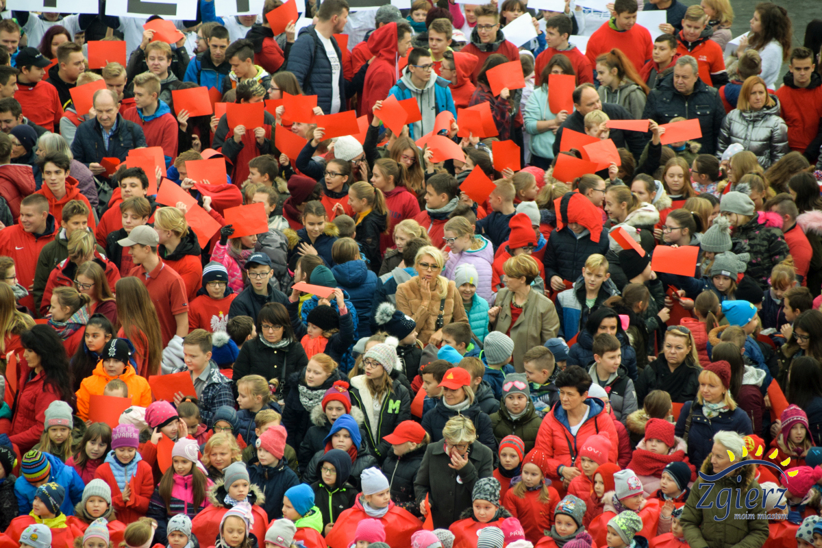 Dzieci i młodzież zgromadzona na pl. Jana Pawła II w Zgierzu