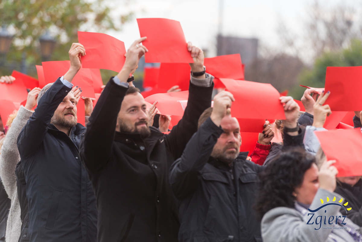 Władze miasta z uniesionymi do góry czerwonymi kartkami
