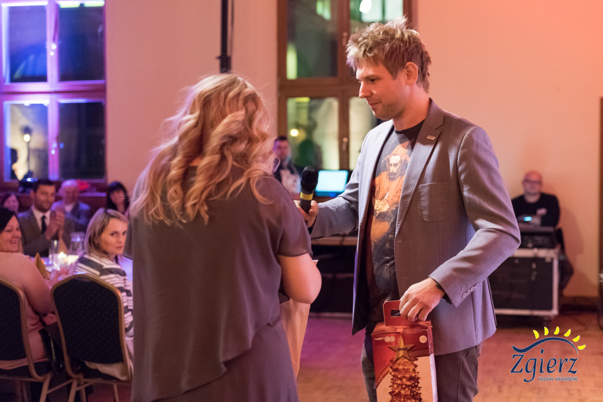 Przemek Waczyński składa gratulacje na ręce Karoliny Miżyńskiej