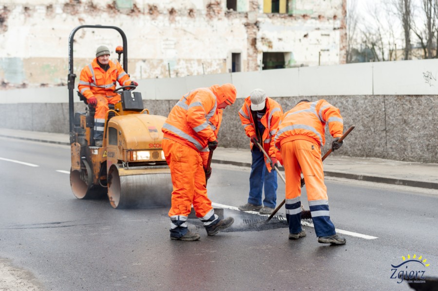Łatanie nawierzchni asfaltowej ulicy 1. Maja