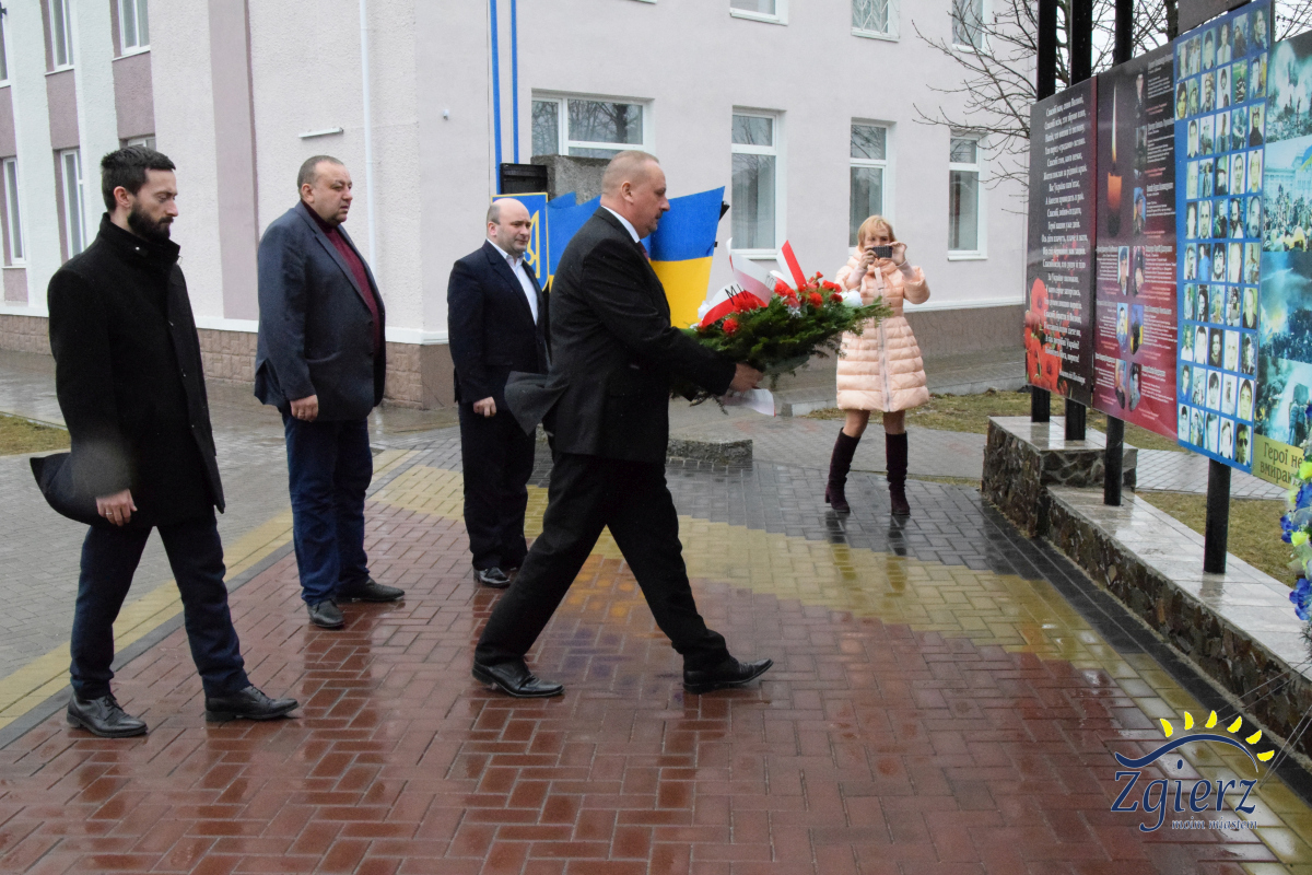 Składanie kwiatów pod tablicą upamiętniającą bohaterów Majdanu oraz wojny rosyjsko-ukraiński