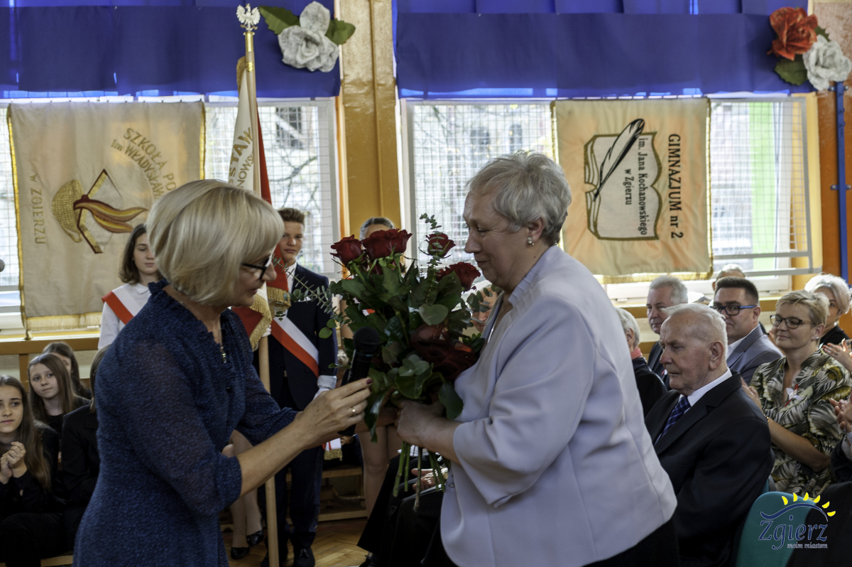 Halina Sypka (dyrektor szkoły) przyjmuje życzenia i gratulacje