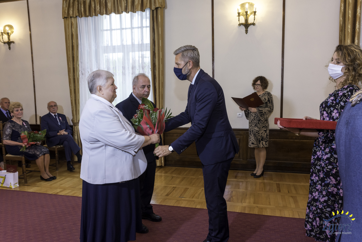 Prezydent Miasta Zgierza wręcza parom medale i kwiaty
