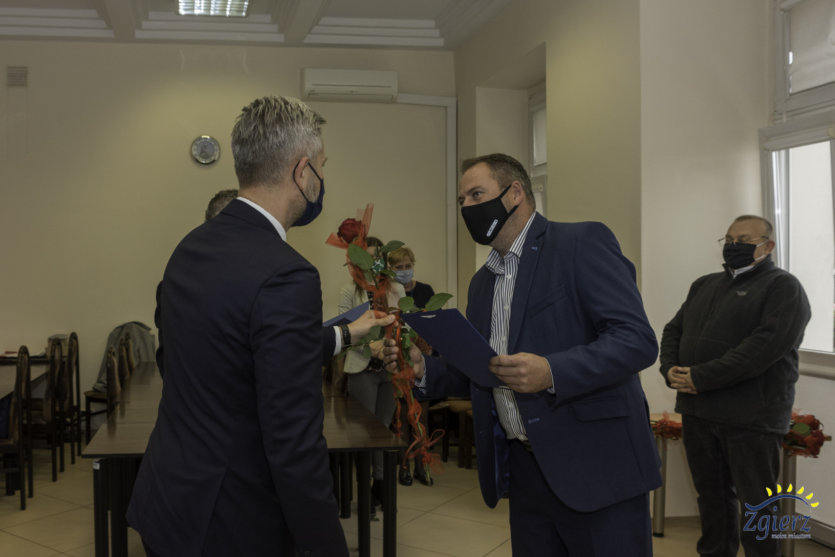 Prezydent Miasta Zgierza wręcza kwiaty nagrodzonym osobom