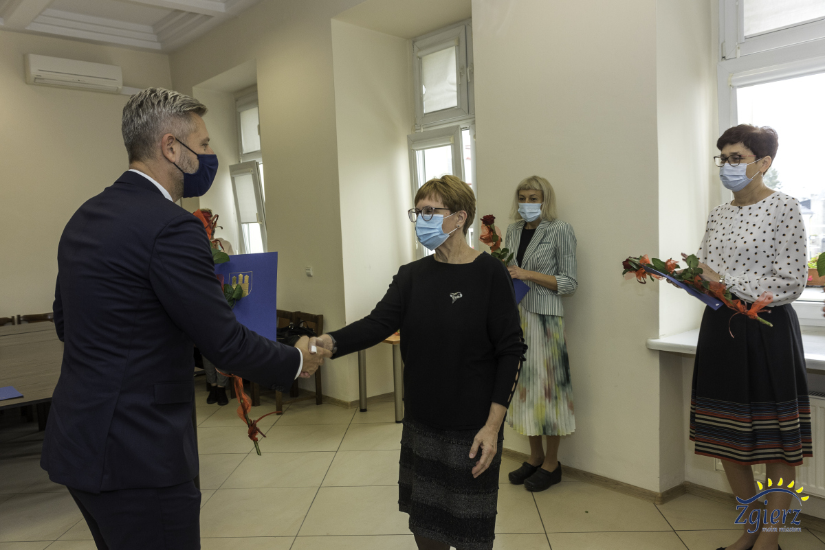 Prezydent Miasta Zgierza wręcza kwiaty nagrodzonym osobom