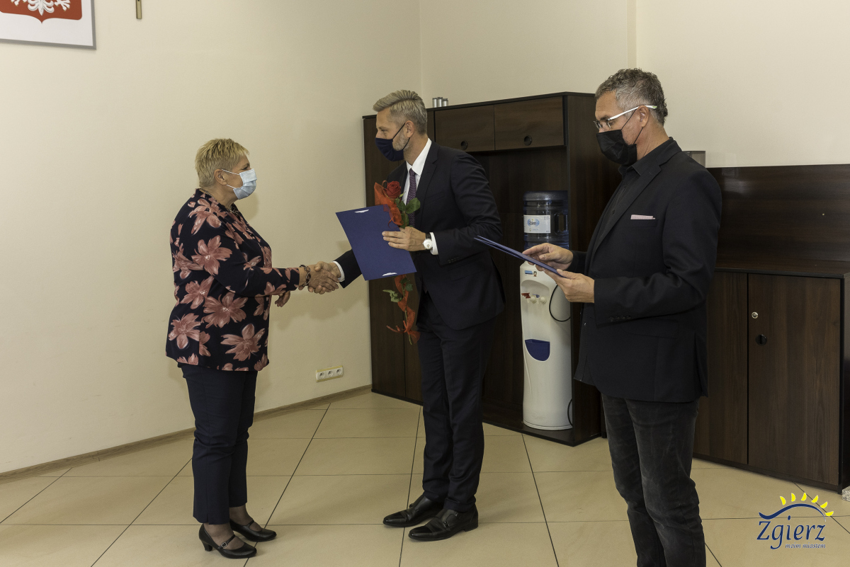 Prezydent Miasta Zgierza wręcza kwiaty nagrodzonym osobom