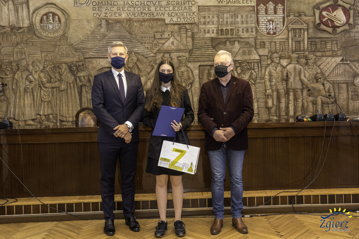 Pamiątkowe zdjęcie laureata konkursu z prezydentem miasta i dyrektorem MOK