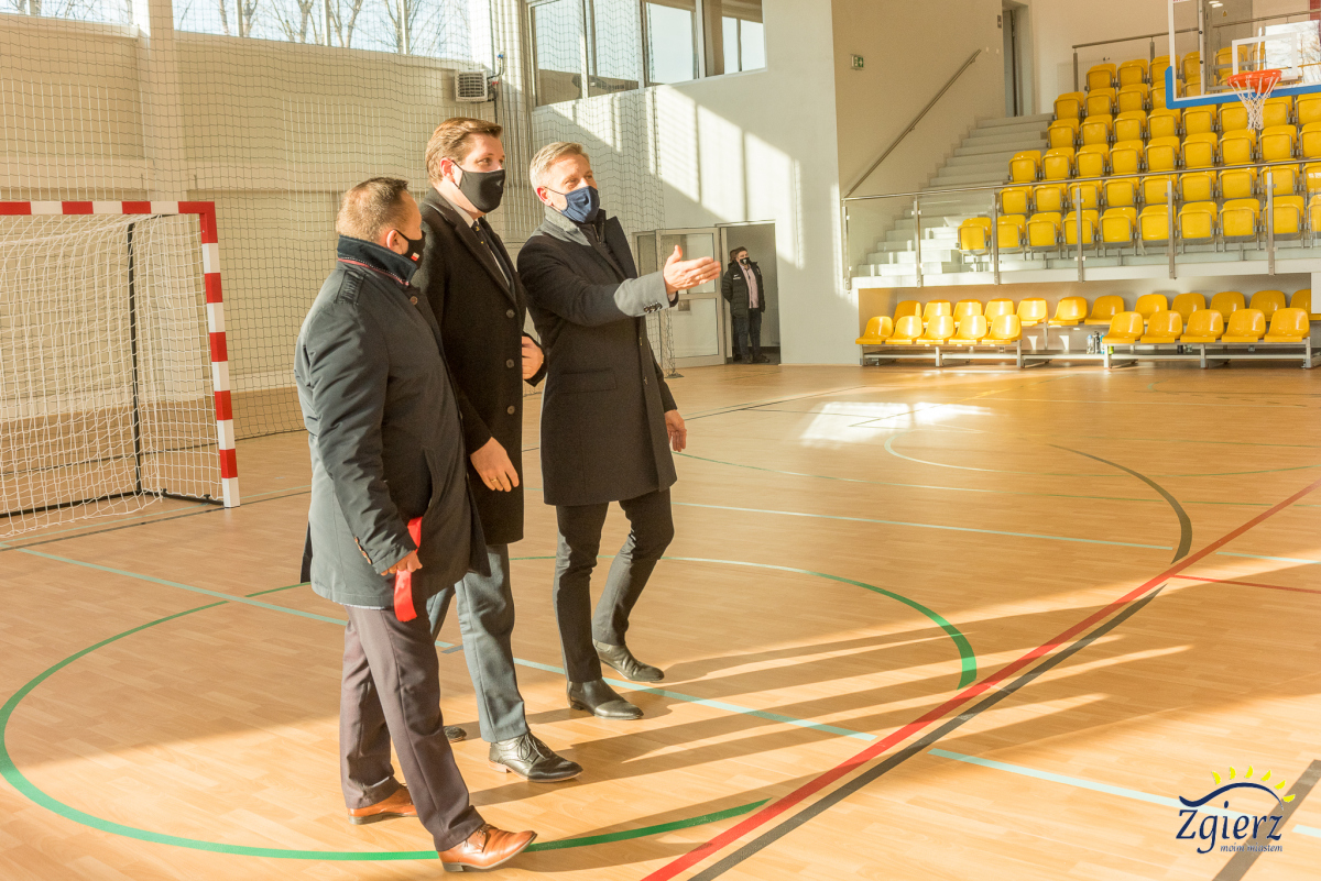 Nową halę sportową oglądają poseł na Sejm RP Marek Matuszewski, Wojewoda Łódzki Tobiasz Bocheński, Prezydent Miasta Zgierza Przemysław Staniszewski