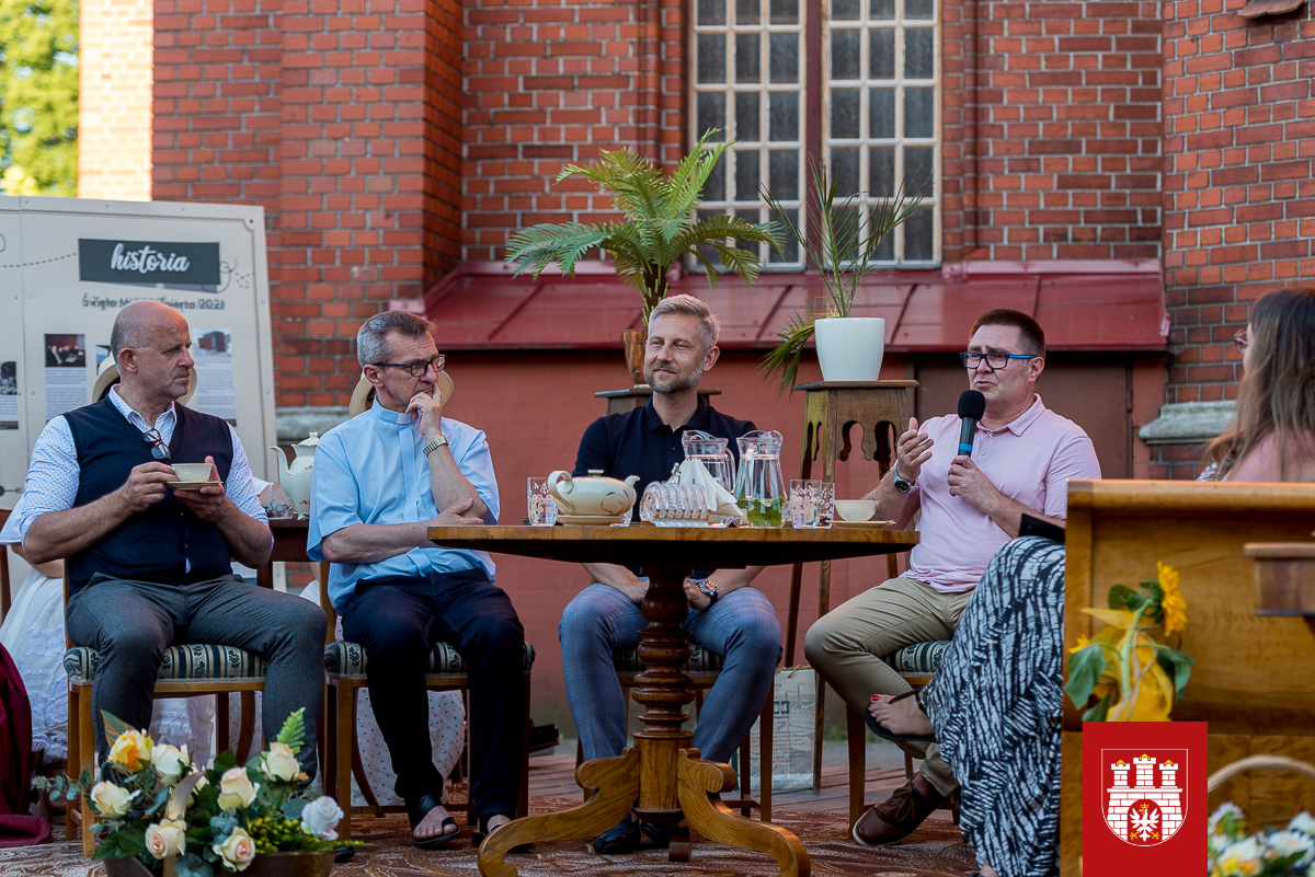 Goście dyskutują siedząc przy stoliku z epoki