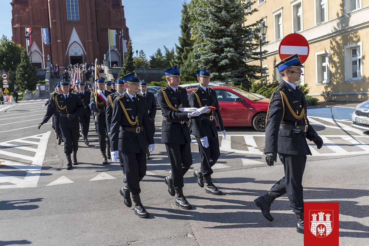 Strażacy wychodzą z kościoła pw. św. Katarzyny Aleksandryjskiej
