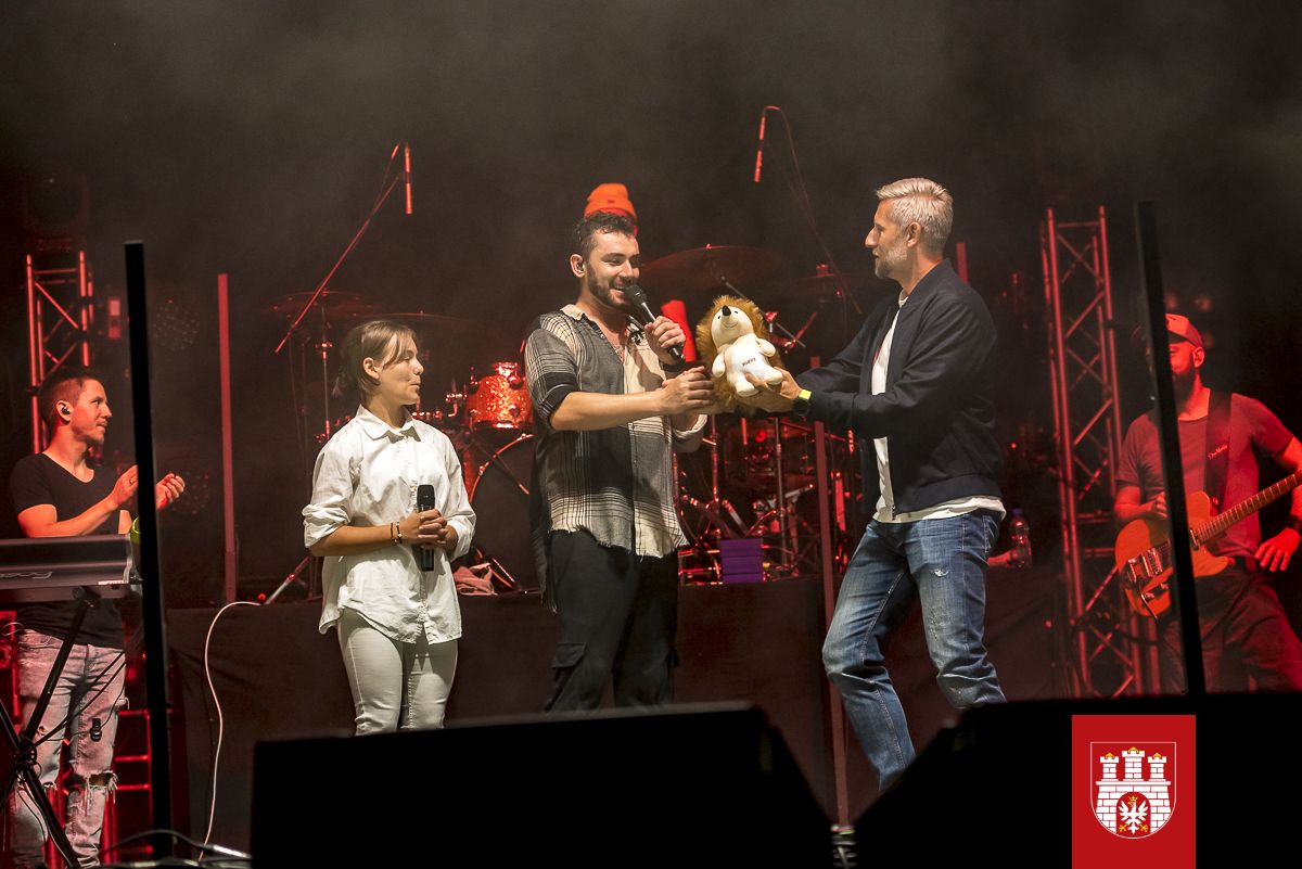 Na scenie Przemysław Staniszewski (Prezydent Miasta Zgierza) wręcza maskotkę Kamilowi Bednarkowi