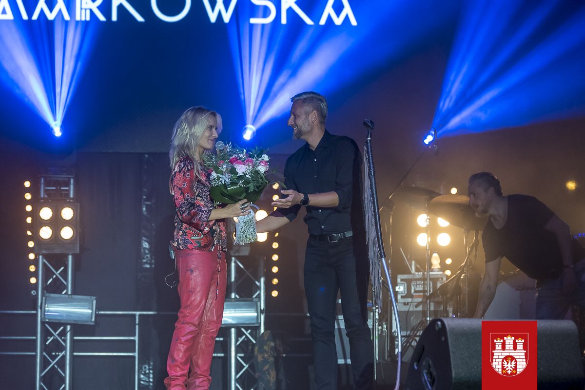 Na scenie Przemysław Staniszewski (Prezydent Miasta Zgierza) wręcza bukiet kwiatów Patrycji Markowskiej