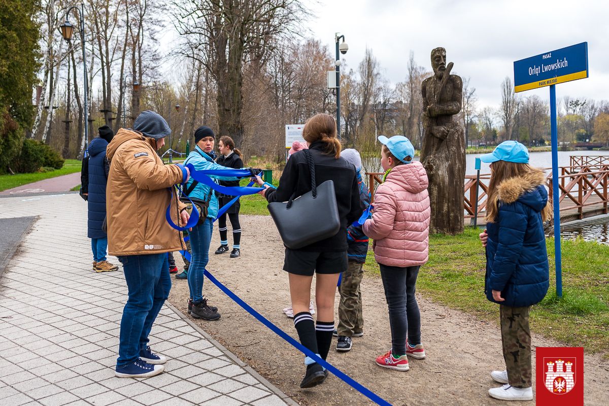 organizatorzy rozciągają niebieską wstążkę w parku miejskim