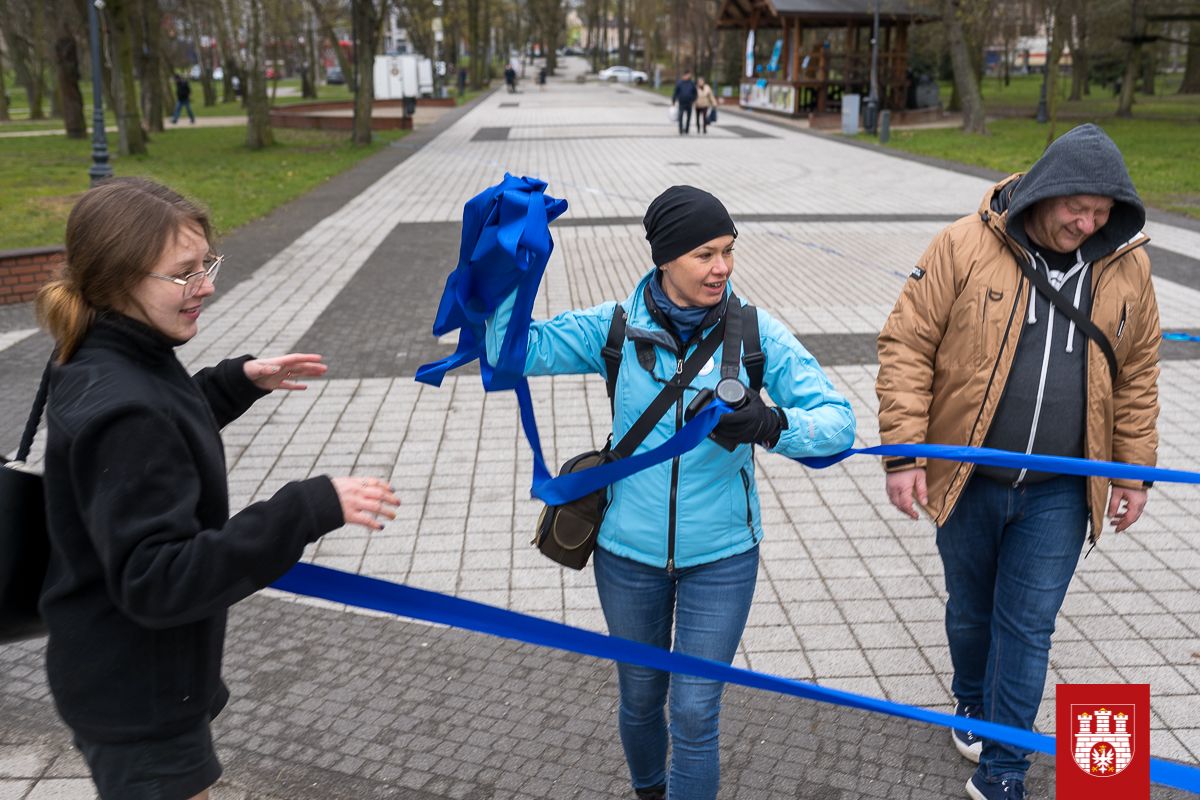 organizatorzy rozciągają niebieską wstążkę w parku miejskim