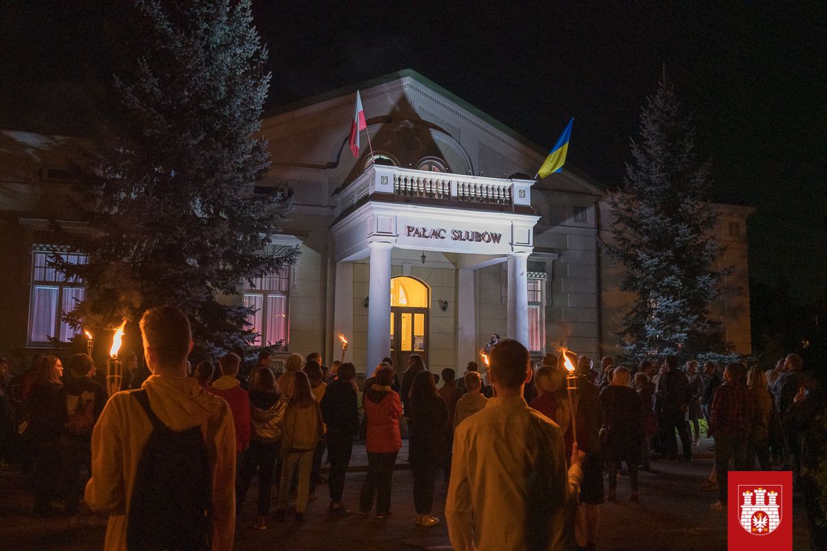 uczestnicy nocnego spaceru przed budynkiem Urzędu Stanu Cywilnego