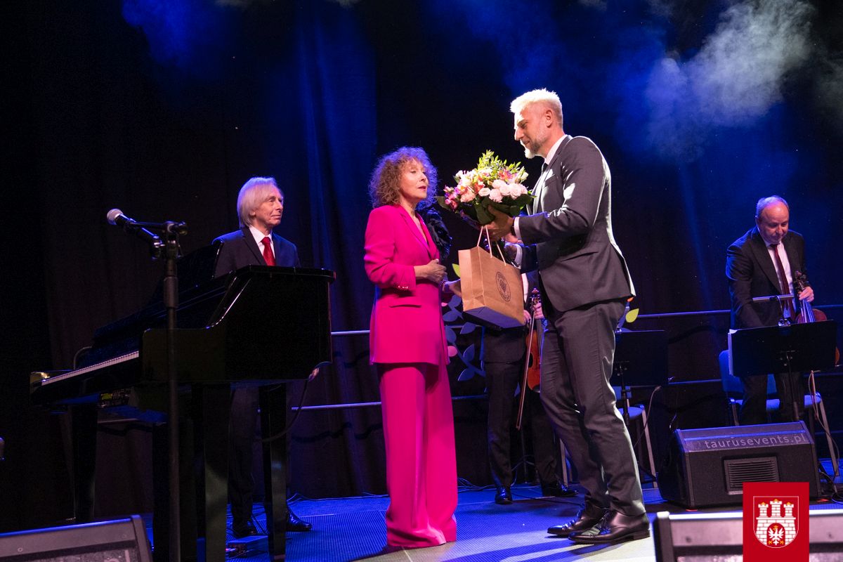 Przemysław Staniszewski wręcza bukiet kwiatów Alicji Majewskiej