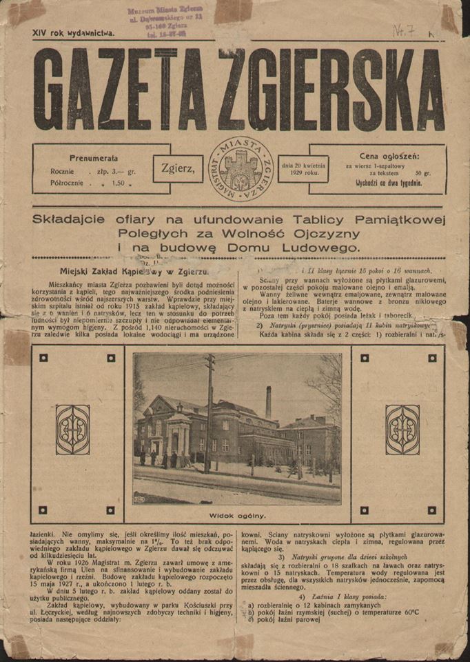 dawna łaźnia - skan Gazety Zgierskiej z 20.04.1929 r.