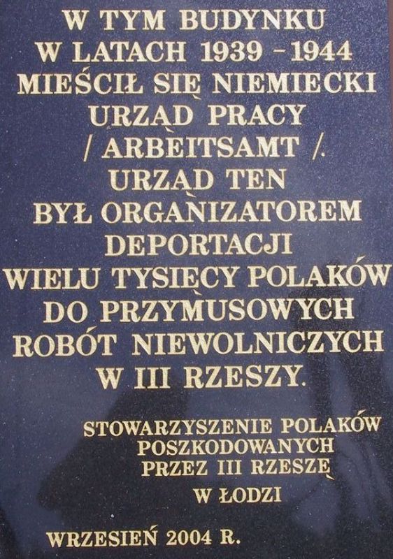 Tablica pamiątkowa - budynek przy ul. Długiej 42 - w latach 1939-1944 mieścił się niemiecki urząd pracy (Arbeistamt) - zdjęcie 2004 r.