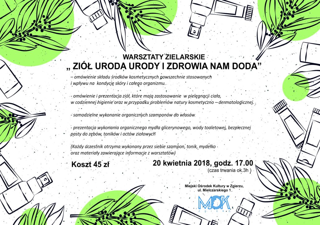 W piątek, 20 kwietnia 2018 r. o godz. 17:00 zapraszamy do Miejskiego Ośrodka Kultury (Zgierz, ul. Mielczarskiego 1) na drugą edycję warsztatów zielarskich z Elżbietą Gorzką-Kmieć - spotkanie zatytułowane "ZIÓŁ URODA URODY I ZDROWIA NAM DODA".
