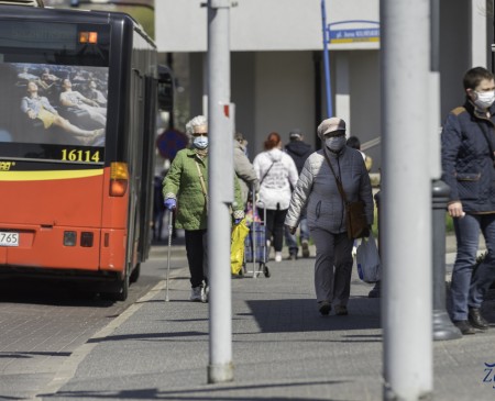 Oczekujący na autobus w maseczkach na placu Kilińskiego