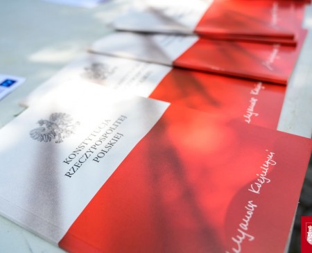 Na zdjęciach poniżej: składanie kwiatów pod tablicami na budynku Ratusza oraz wspólne czytanie Konstytucji RP.