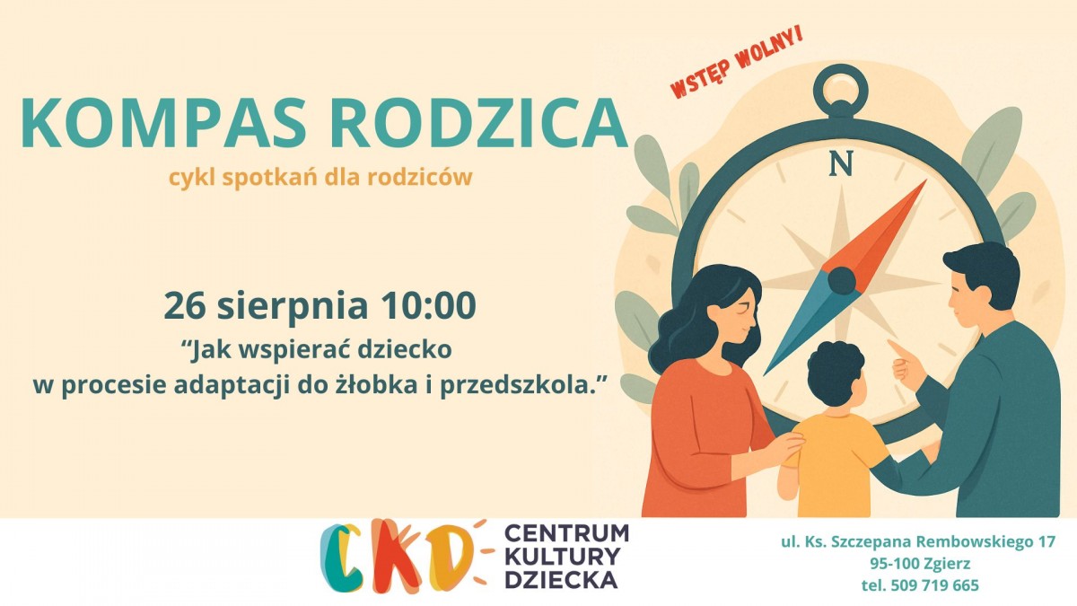 Centrum Kultury Dziecka (CKD) w Zgierzu serdecznie zaprasza rodziców/opiekunów na otwarty, bezpłatny cykl spotkań "Kompas Rodzica", podczas których wspólnie zgłębimy tematy związane z rozwojem dzieci, skuteczną i pełną szacunku komunikacją oraz nawiązywaniem trwałych, dobrych relacji z pociechami.