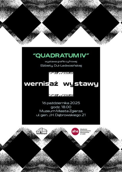 "Quadratum IV" to wystawa grafiki cyfrowej autorstwa Elżbiety Dul-Ledwosińskiej, związanej naukowo z Akademią Humanistyczno-Ekonomiczną. "Quadratum IV" to kwadraty, ale każdy z nich jest zupełnie inny. "Quadratum IV" to wystawa, której bohaterem jest kwadrat.