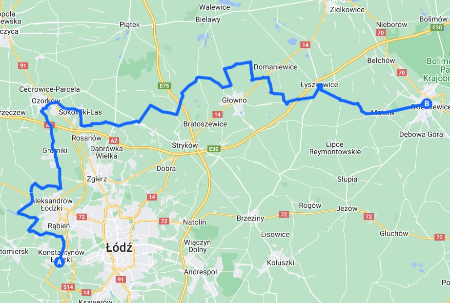 • zaczynając od miejscowości Krzywiec (Gmina Aleksandrów Łódzki) 17:45, opuszczenie granic powiatu miejscowość Krzywiec 17:49 i ponowny wjazd na teren powiatu zgierskiego w miejscowość Izabelin, Gmina Aleksandrów Łódzki 17:55;