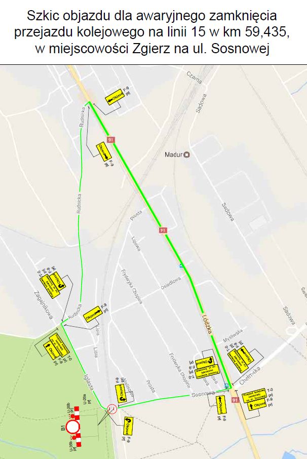 W związku z awaryjnym zamknięciem przejazdu kolejowego w Zgierzu przy ul. Sosnowej informujemy, iż w dniu 21 czerwca w godz. 15:00-21:00 zostanie poprowadzony objazd ulicą Rudnicką zgodnie z załączonym schematem tymczasowej organizacji ruchu.