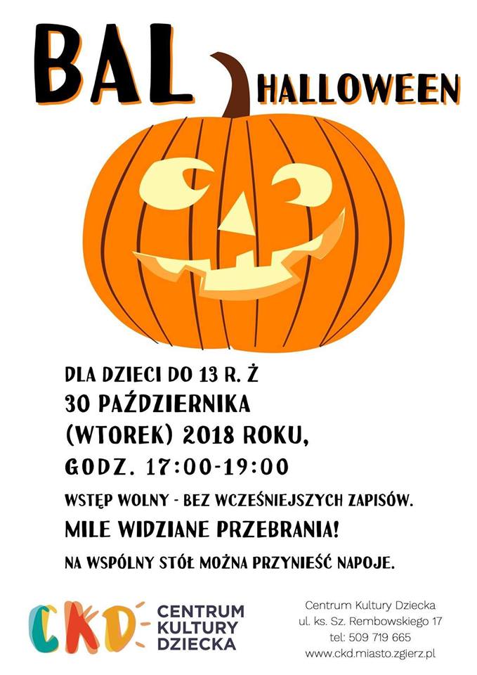 30 października 2018 roku w godz. 17:00-19:00 Centrum Kultury Dziecka (CKD - ul. ks. Sz. Rembowskiego 1) zaprasza wszystkie dzieciaki do 13 roku życia wraz z rodzicami, opiekunami na Strrrraszny Bal Halloweenowy.