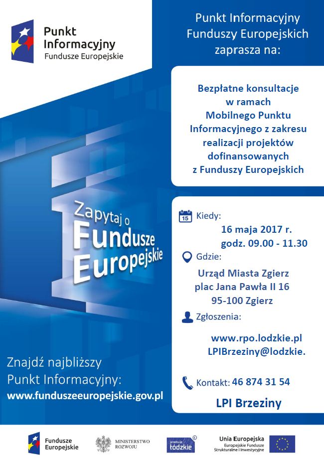 Spotkanie informacyjne odbędzie się w Urzędzie Miasta Zgierza (pl. Jana Pawła II 16, sala konferencyjna 114), w dniu 16 maja 2017 r. w godzinach 9:00-11:30.