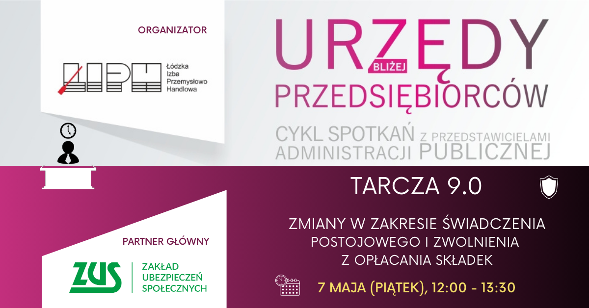 Zakład Ubezpieczeń Społecznych (ZUS) I Oddział w Łodzi oraz Łódzka Izba Przemysłowo-Handlowa (ŁIPH) zapraszają na bezpłatne webinarium nt. "Tarcza 9.0 – zmiany w zakresie świadczenia postojowego i zwolnienia z opłacania składek".