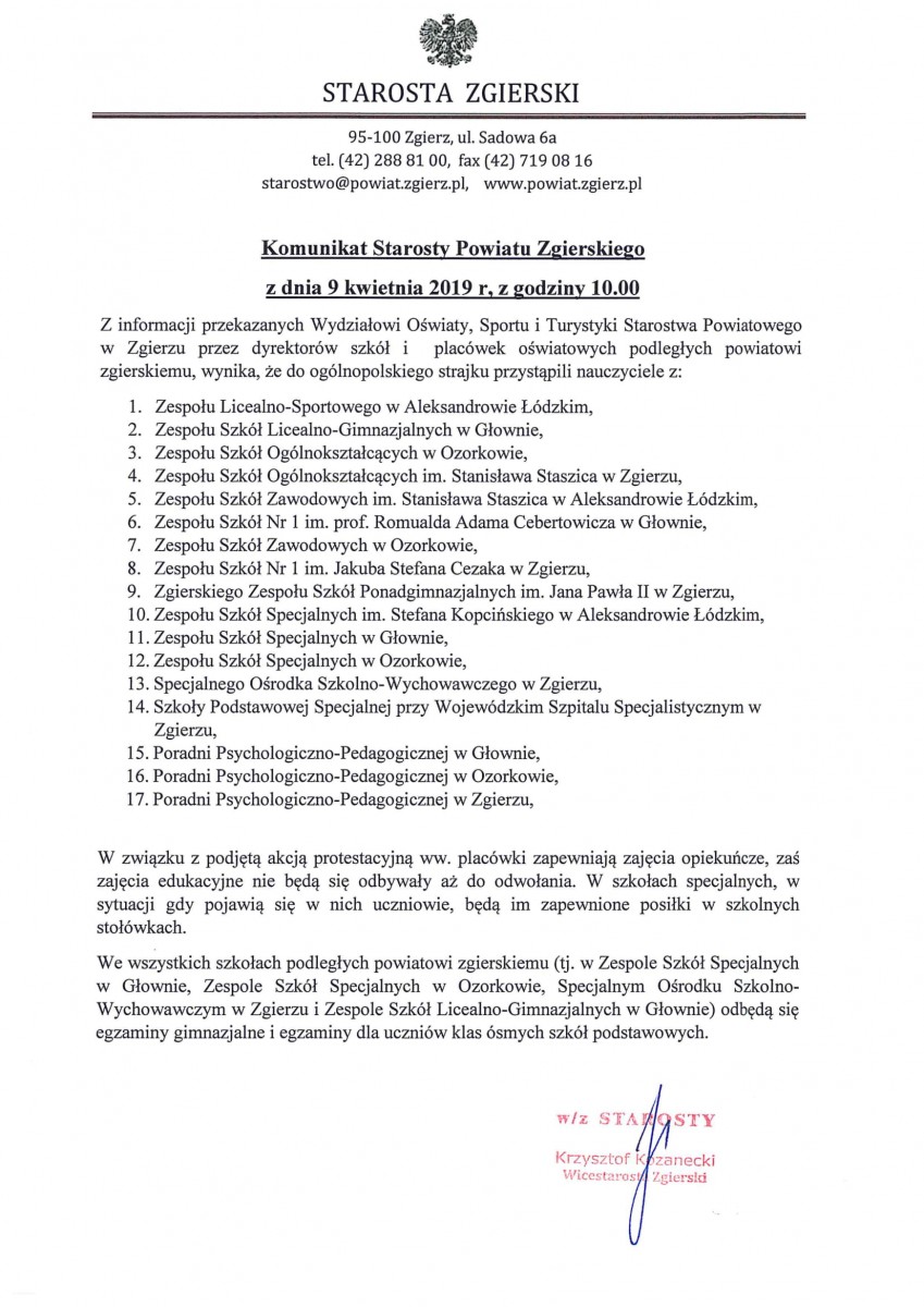 Na podstawie Komunikatu Starosty Powiatu Zgierskiego z dnia 9 kwietnia 2019 r. z godz. 10:00