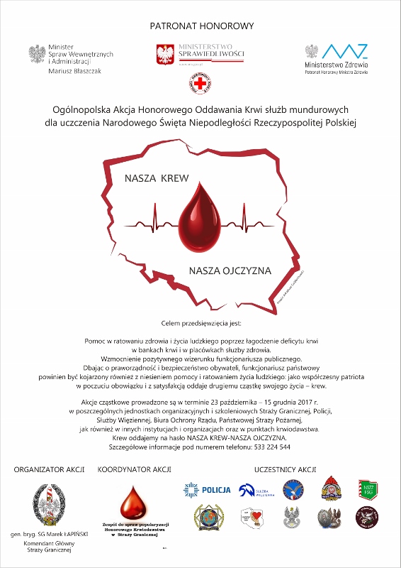 Narodowe Święto Niepodległości jest doskonałą okazją do zorganizowania akcji honorowego oddawania krwi funkcjonariuszy służb mundurowych, której przyświeca hasło NASZA KREW- NASZA OJCZYZNA.