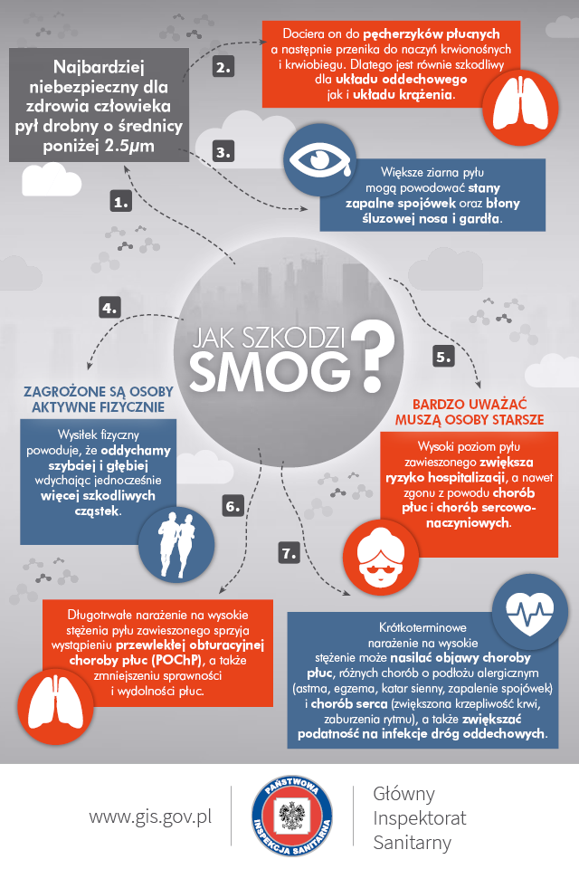 Związki chemiczne zawarte w smogu (np. benzopiren) i pyły (PM10 i PM 2,5), są szkodliwe dla naszego zdrowia. Mogą one m.in. wywoływać alergie, przyczyniać się do rozwoju chorób płuc, czy też nowotworów.