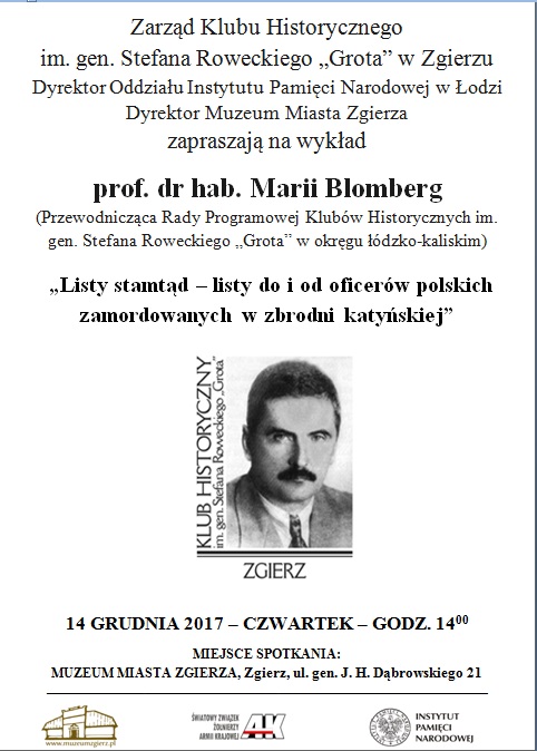 Zapraszają: Zarząd Klubu Historycznego im. gen. Stefana Roweckiego "Grota" w Zgierzu oraz Dyrektor Muzeum Miasta Zgierza.