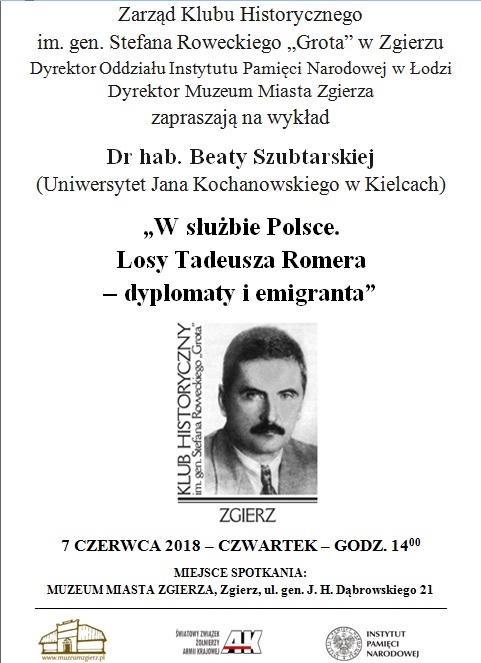 7 czerwca 2018 r. godz. 14:00 wykład na temat "W służbie Polsce. Losy Tadeusza Romera - dyplomaty i emigranta" wygłosi dr hab. Beata Szubtarska (Instytut Historii i Stosunków Międzynarodowych UJK w Kielcach).