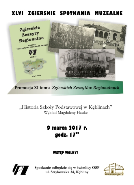 Dyrektor Muzeum Miasta Zgierza zaprasza na XLVI Zgierskie Spotkania Muzealne, podczas których odbędzie się promocja XI tomu Zgierskich Zeszytów Regionalnych oraz wykład Magdaleny Hauke "Historia Szkoły Podstawowej w Kęblinach".