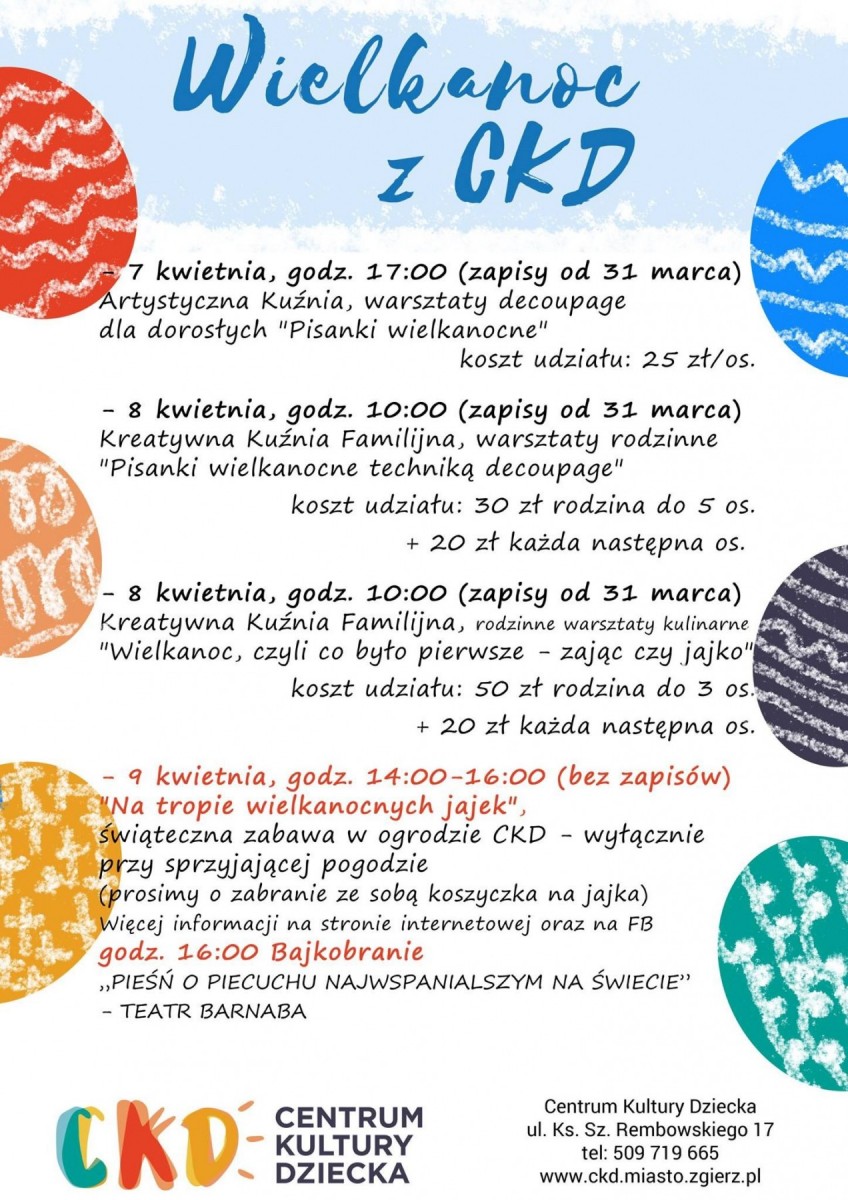 Centrum Kultury Dziecka (CKD - ul. ks. Sz. Rembowskiego 17) zaprasza na wydarzenia związane ze Świętami Wielkanocnymi: