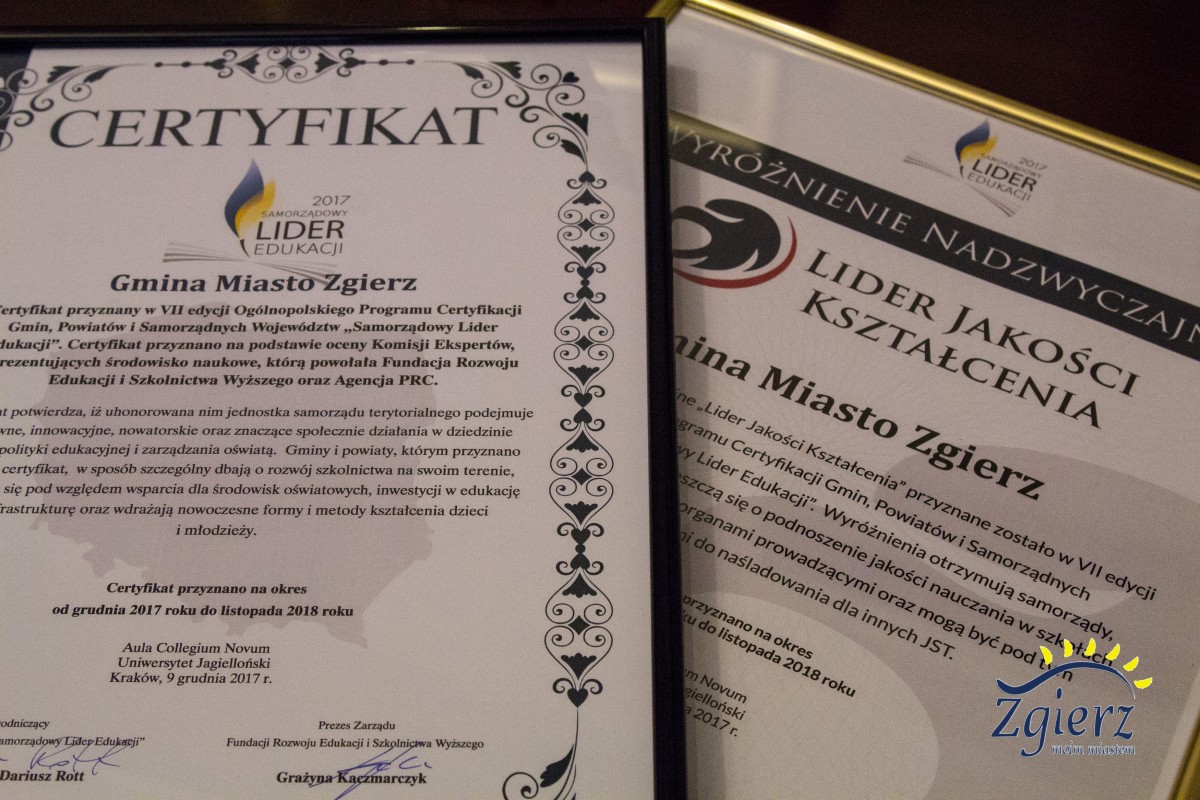 Nasze miasto otrzymało certyfikat "Samorządowy Lider Edukacji" w kategorii gminy o liczbie między 50.001 do 100.000 mieszkańców (woj. łódzkie), a podczas uroczystości w Auli Collegium Novum Uniwersytetu Jagiellońskiego, okazało się, że Zgierz dodatkowo wyróżniono tytułem "Lider Jakości Kształcenia".