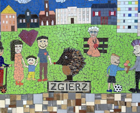 Zdjęcie mozaiki na ścianie budynku MOK - fot. Fundacja Niebieskie Migdały